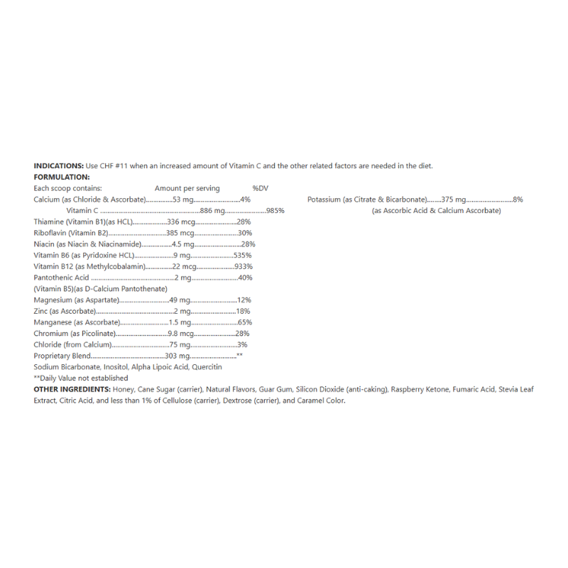 CHF #11 Vitamin C Energy Drink is an excellent vitamin C drink mix designed to support energy levels and the immune system. This convenient powder offers a fast-absorbing alternative to pills or capsules, making it an easy way to increase your vitamin C intake.*