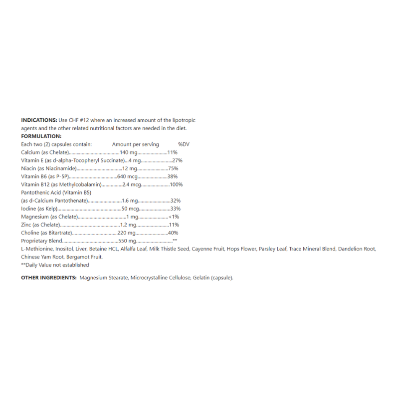 CHF #12 Liver+ is a high-potency lipotropic formula designed to support liver function and promote detoxification. This supplement combines essential vitamins, minerals, and herbal extracts to aid in fat metabolism and the elimination of toxins, supporting overall metabolic health.*