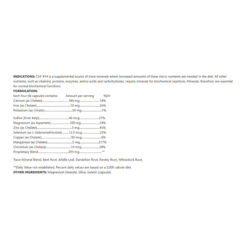 CHF #14 Multi-Mineral is a complex multiple mineral formula combined with Red Beet Root and a base of five herbs. This supplement provides a supplemental source of trace minerals to support overall health and well-being.*