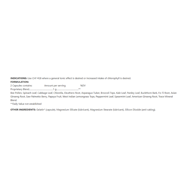 CHF #28 Greens is a specially formulated supplement containing chlorella and other natural micro-nutrients designed to radiate energy and support overall wellness. This green superfood blend is crafted to enhance your daily nutrition and promote vitality.*