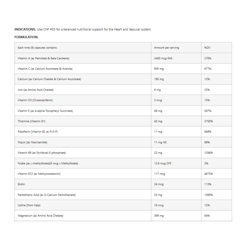 CHF #33 Heart+ is a specialized supplement formulated to support overall cardiovascular health. This blend combines essential vitamins and minerals to promote optimal heart function and vascular integrity.*