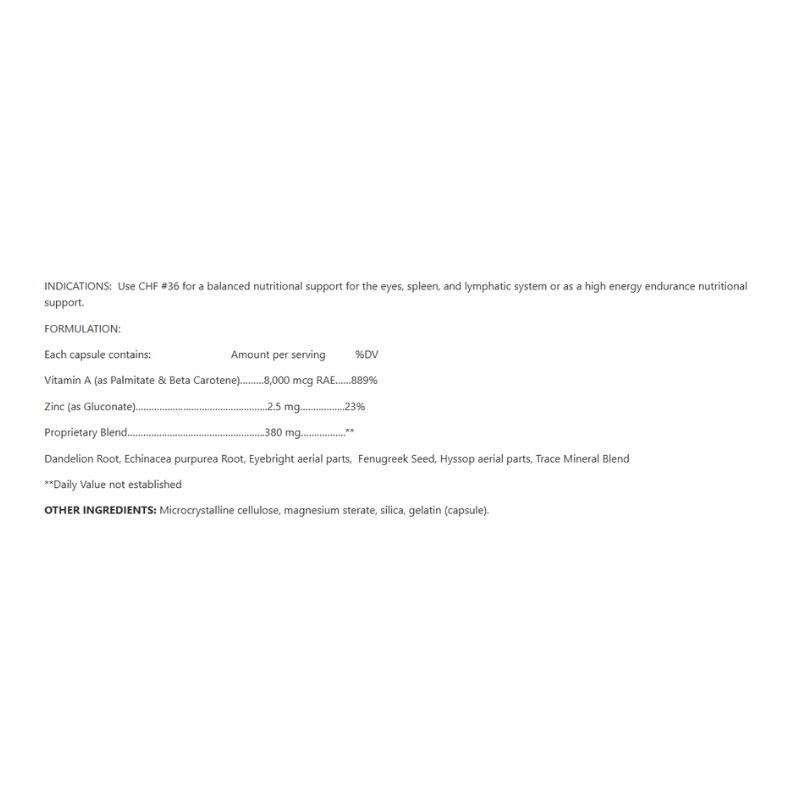 CHF #36 Vitamin A+ is a specialized dietary supplement formulated to support eye health, skin integrity, and immune function. This blend provides a potent dose of Vitamin A, essential for maintaining healthy vision, promoting skin health, and supporting the body's natural defense mechanisms.*