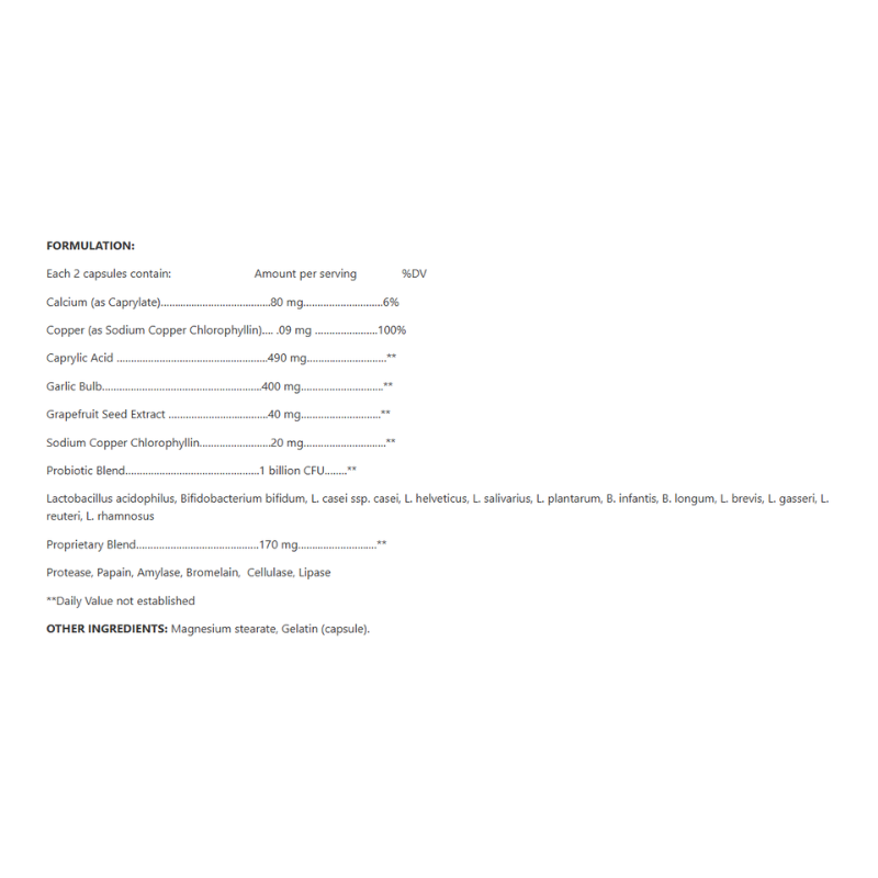 - Calcium Caprylate – Helps to rebalance friendly flora and reduce an overabundance of Candida albicans yeast in the body*