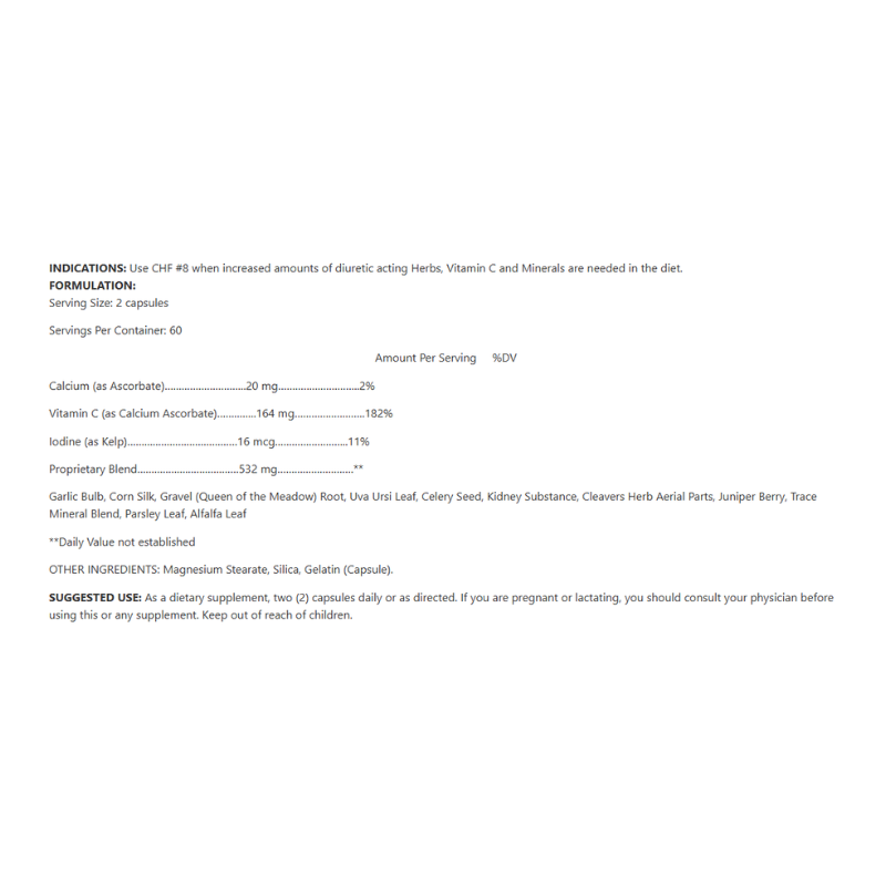 CHF #8 Kidn+ Diurtc is a mild, natural kidney and diuretic formula designed to support healthy kidney function and promote balanced fluid levels in the body. This unique blend combines herbs, raw kidney tissue, essential minerals, vitamin C, and garlic to provide comprehensive support for the urinary system.*