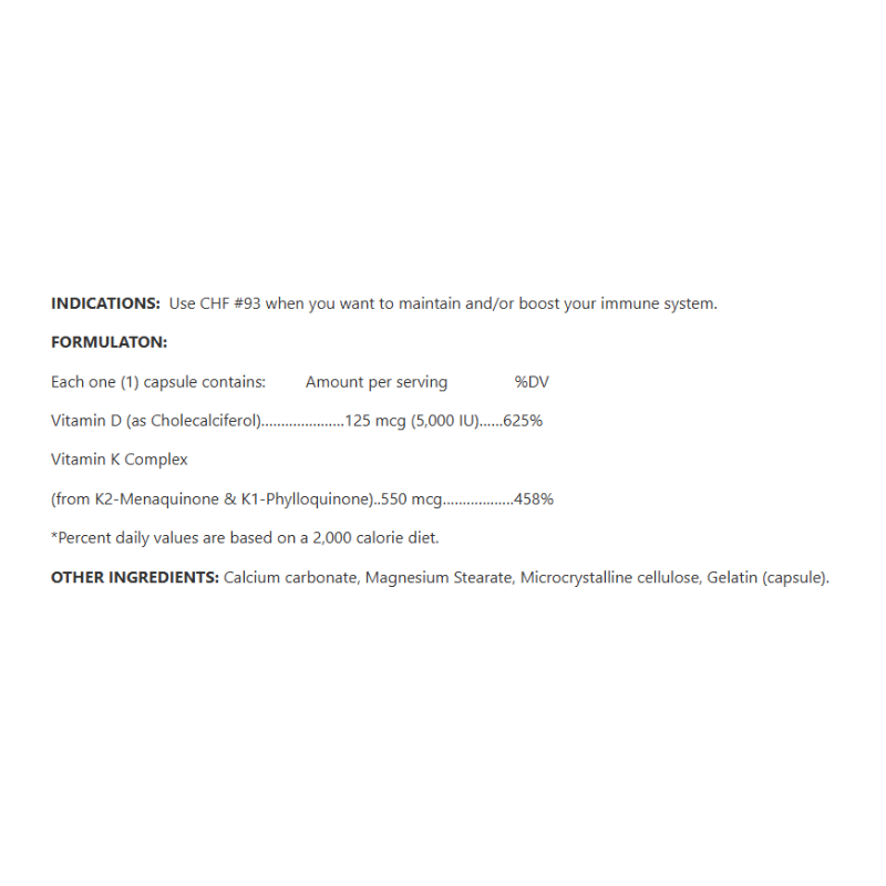 CHF #93 Vitamin D provides 5,000 IU of vitamin D3 (cholecalciferol) per capsule, formulated to support the body's natural immune functions and maintain healthy bones.*