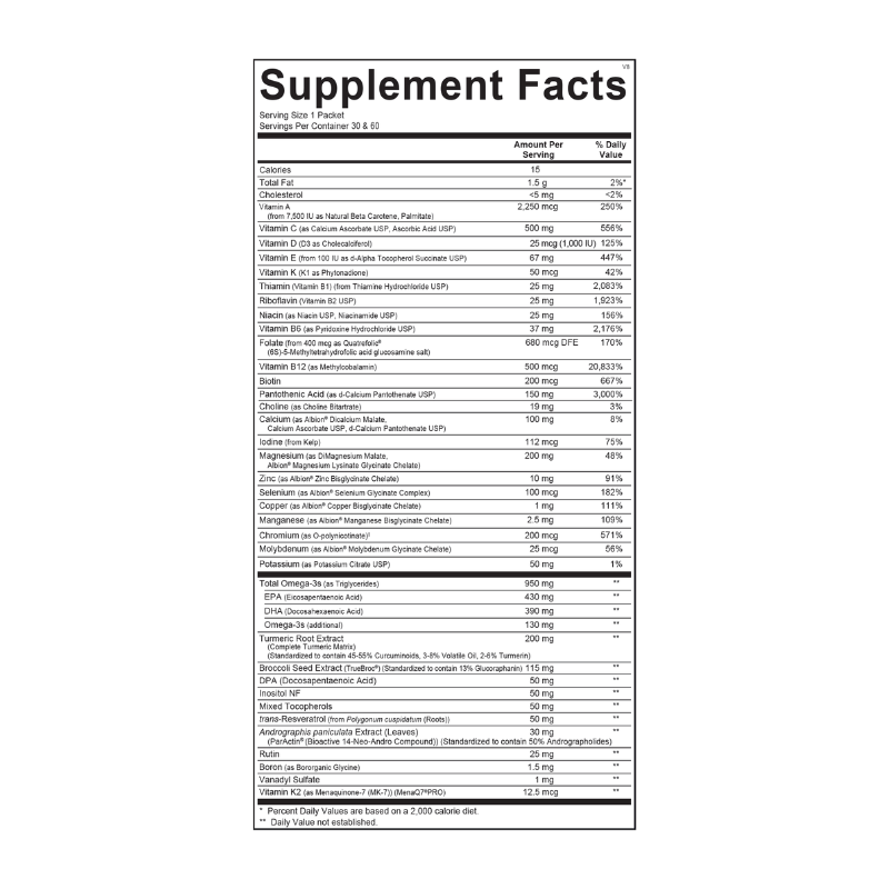 Each packet delivers bioavailable vitamins and Albion® chelated minerals for superior absorption. It features Quatrefolic® (100% 5-MTHF) for optimal folate support, helping with energy production, DNA repair, and cardiovascular health. The omega-3s—EPA, DHA, and DPA—are provided in a re-esterified triglyceride form for enhanced absorption and purity. Resvoxitrol, a specialized antioxidant blend with turmeric, resveratrol, broccoli seed extract, and andrographis, helps combat oxidative stress.