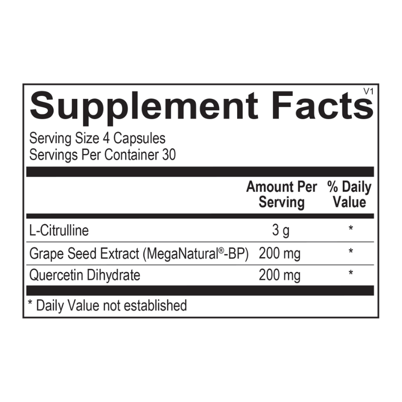 L-citrulline in CitruNox is a potent nitric oxide precursor that bypasses liver metabolism for superior bioavailability, helping sustain healthy nitric oxide levels for improved vasodilation and blood circulation. Quercetin, a natural antioxidant, supports inflammatory balance and endothelial health, while MegaNatural® BP grape seed extract enhances nitric oxide production and promotes arterial elasticity.