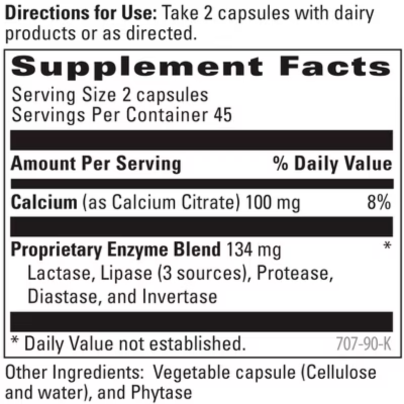 - Lactase – Aids in the digestion of lactose, the sugar found in dairy products*