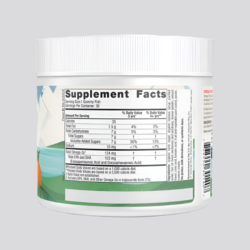 Nordic Omega-3 Gummy Fish provide a tasty and convenient way to support your child's omega-3 intake. Each serving delivers 124 mg of total omega-3s, including EPA and DHA, essential for healthy brain, eye, and nervous system development.*
