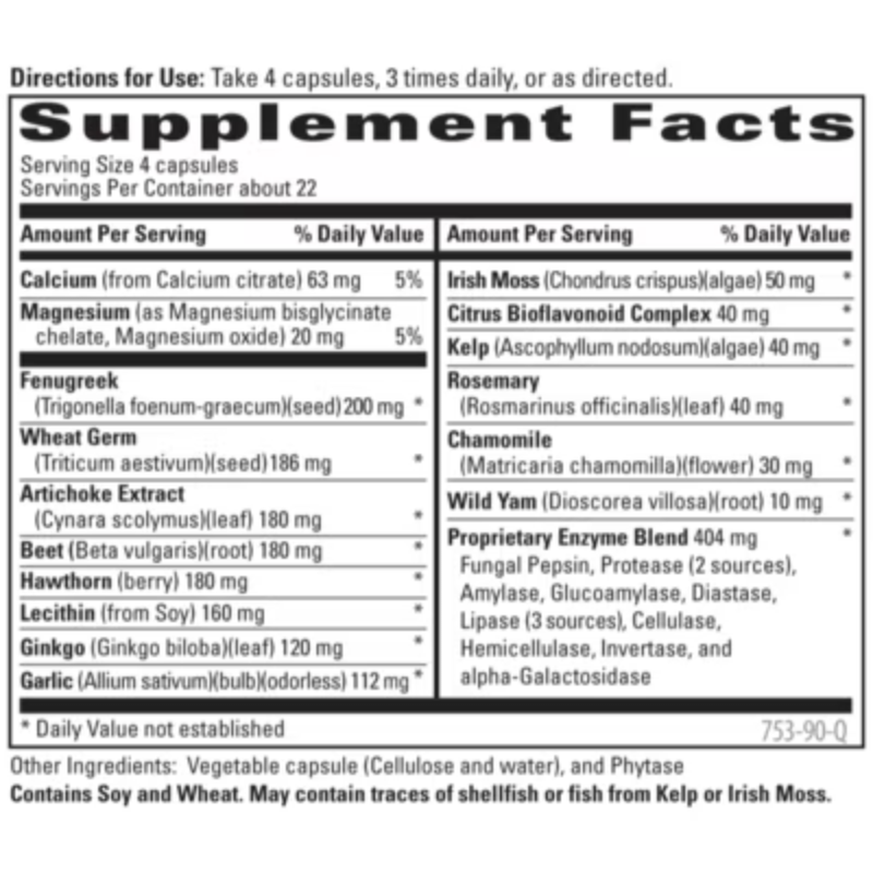 - Enzyme Blend: Fungal Pepsin, Amylase, Protease, Glucoamylase, Diastase, Cellulase, Lipase, Hemicellulase, Invertase, Alpha-Galactosidase, Phytase – Facilitates comprehensive digestion and nutrient absorption*